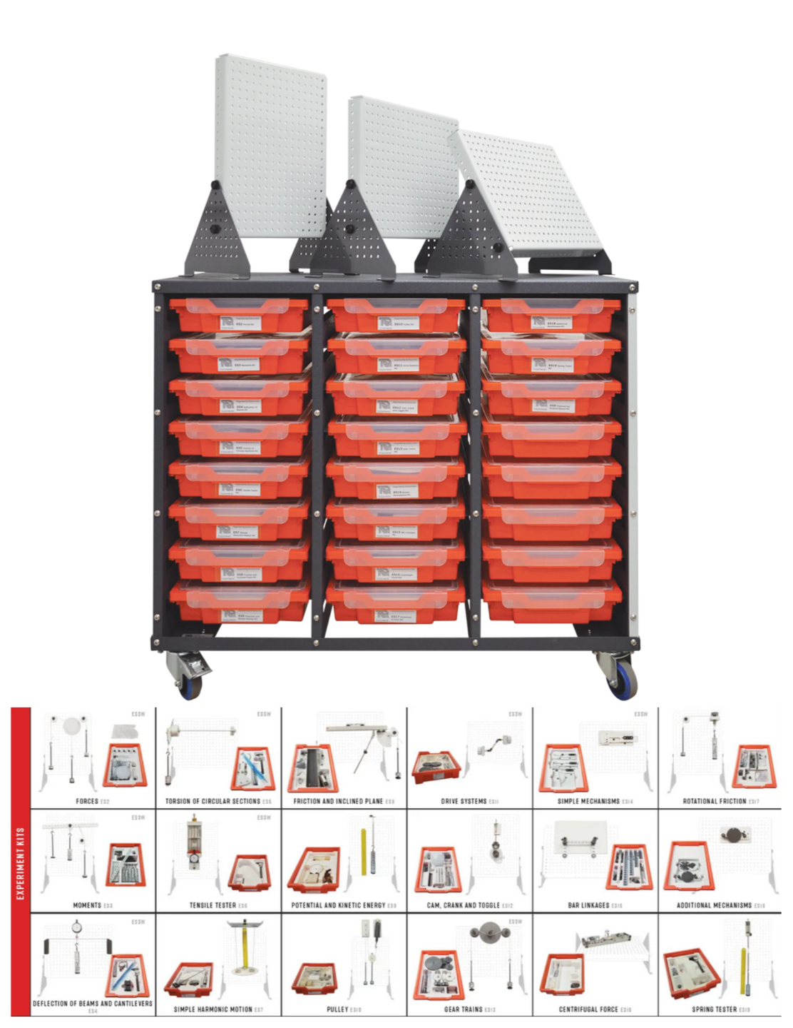 A complete set of TecQuipment’s Engineering Science kits and three Work Panels within a mobile trolley.